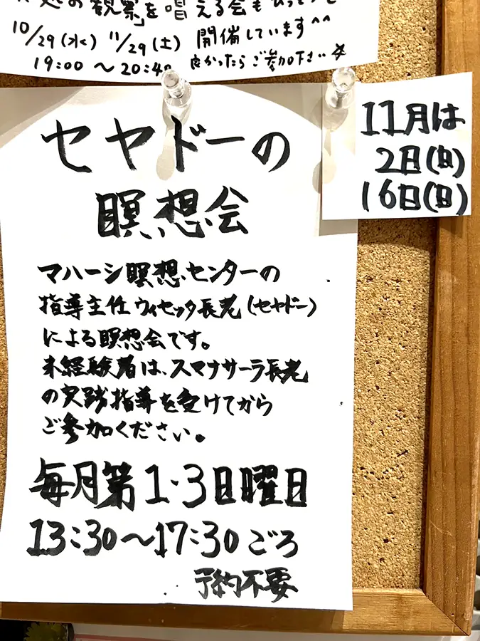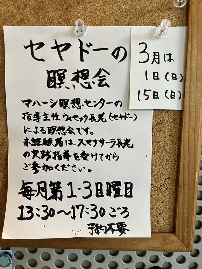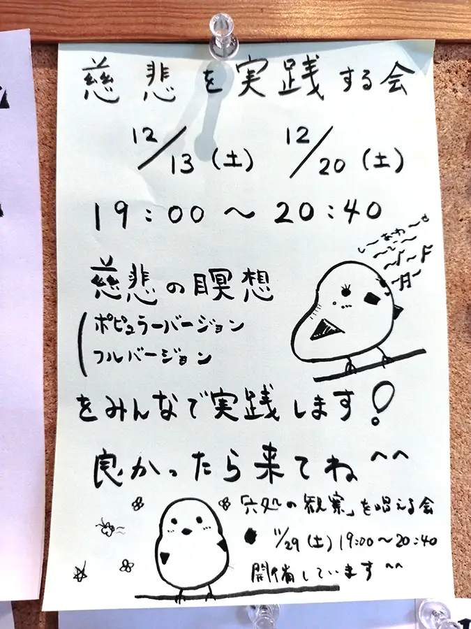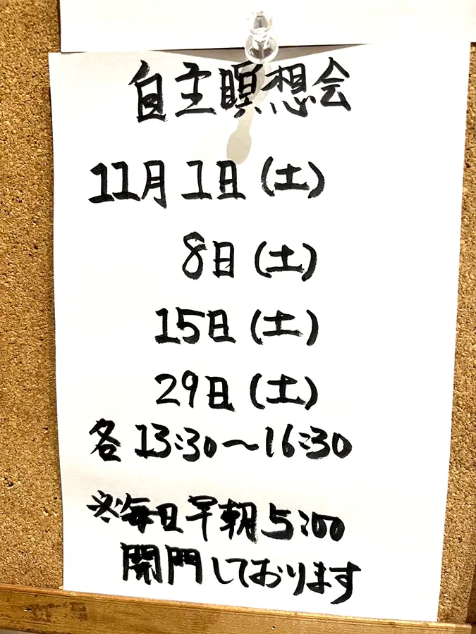 - お寺で瞑想したい方のために、13時30分から16時30分を自主瞑想会として開放しています。