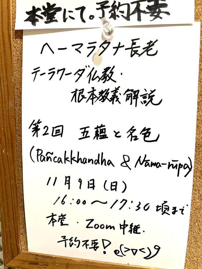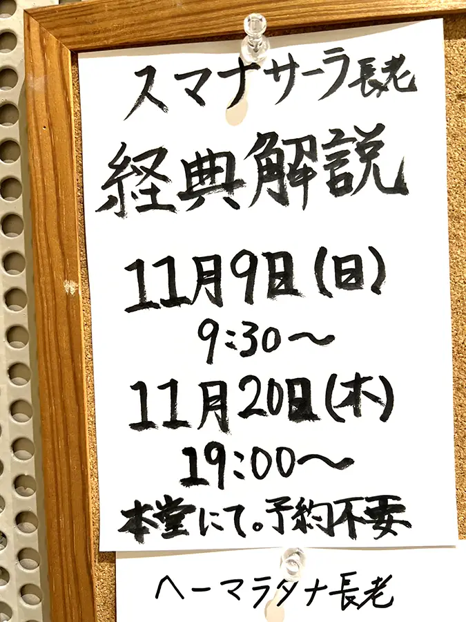 11月9日(日)は、9時30分から「スマナサーラ長老の経典解説」、16時から「ヘーマラタナ長老の根本教義解説」 です。