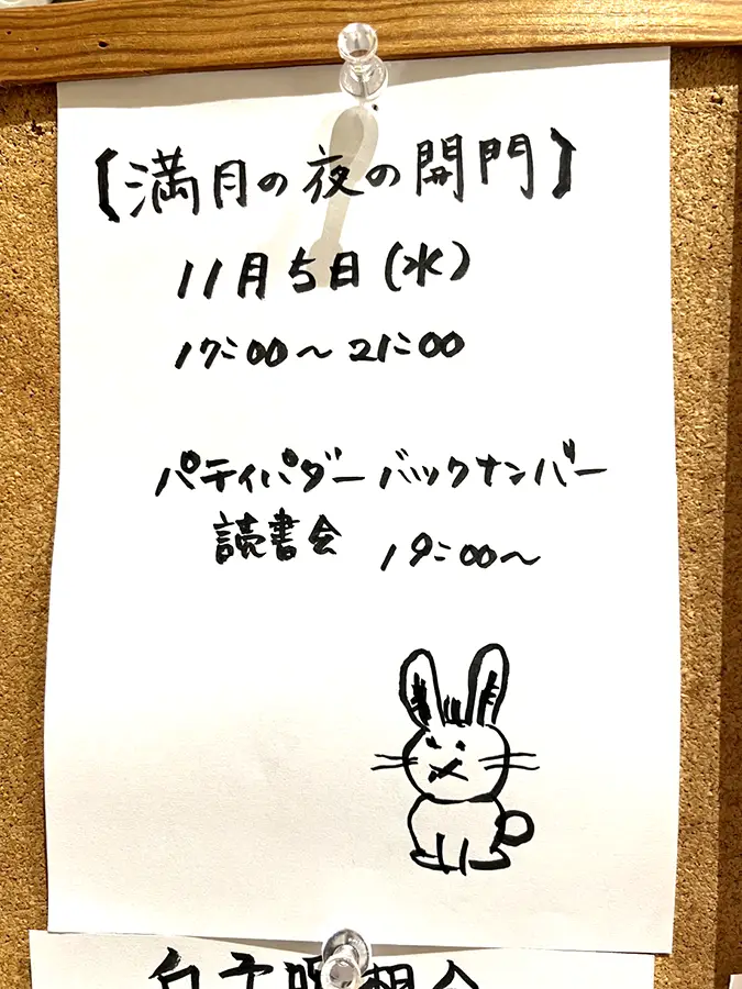 「満月の夜開門」は11月5日(水)17時〜。パティパダーバックナンバー読書会は19時から行います。