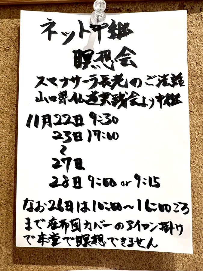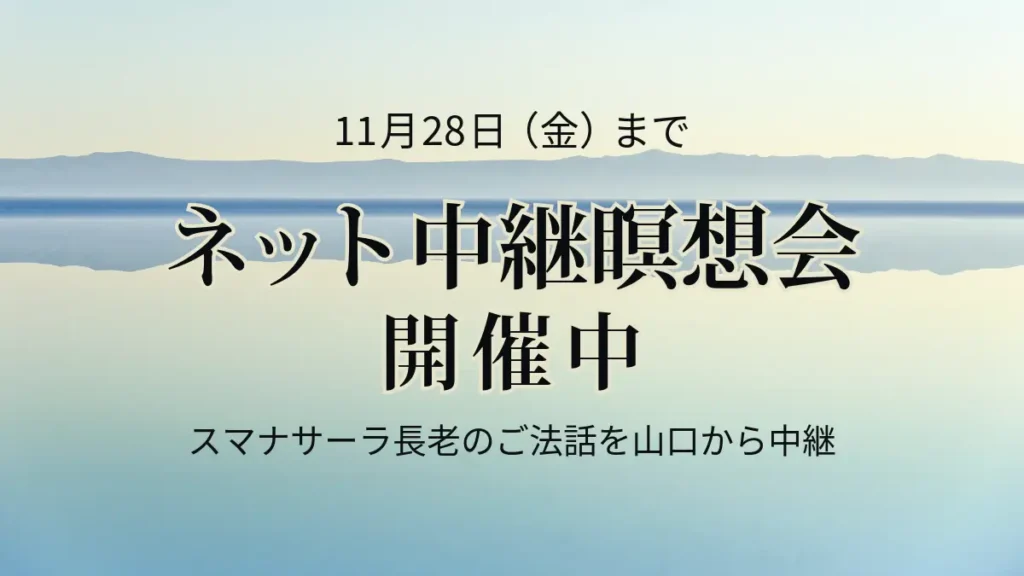 11月22日(土)から28日(金)まで、山口県仏道実践会からのネット中継による瞑想会が行われます。