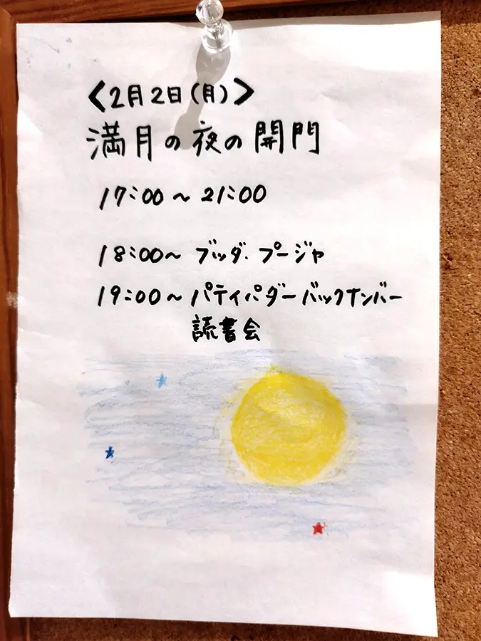 2月2日(月)17時〜21時は「満月の夜開門」です。19時からは「パティパダーバックナンバー読書会」を行います。