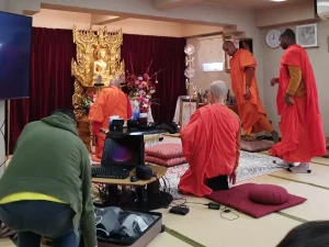 ですから我々はここで積んだすべての功徳を、仏教を守る神々、この日本を守る神々、皆様個人個人を守る神々、すべての神々、功徳を欲しいと思っているすべての神々に回向をいたしましょう。全ての神々が幸福でありますように、安らかになりますように涅槃解脱に達することができますようにと3回。サードゥ。