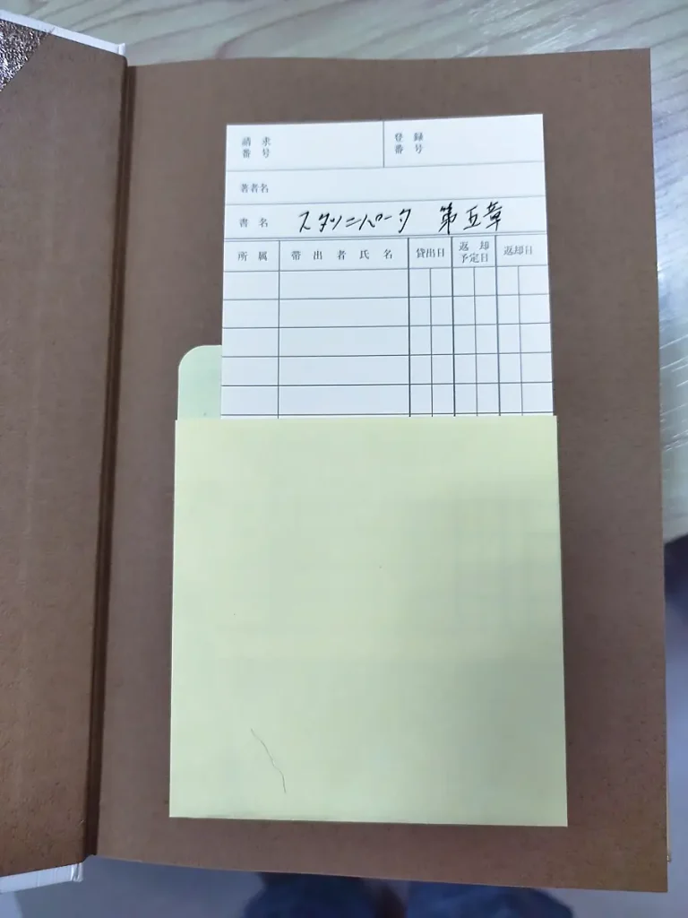 裏表紙をめくったところに、ポケットを貼って貸出し票を入れます。昔は図書館などもこんな風なシステムでお借りしましたっけ。
