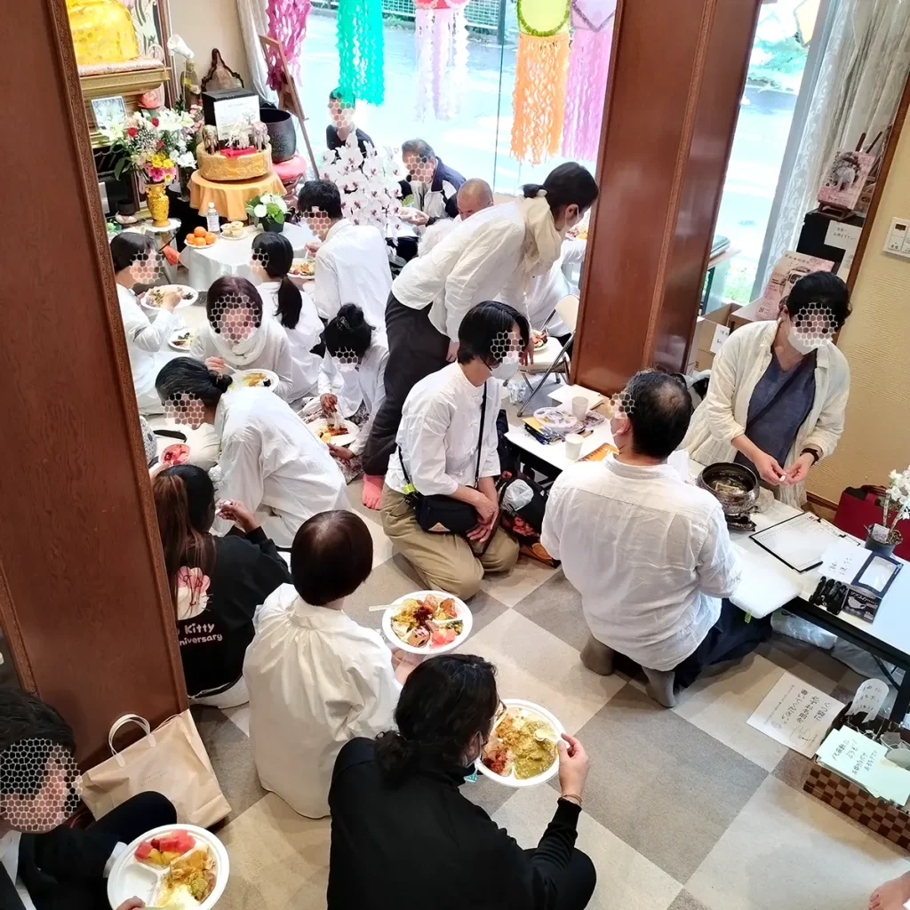 お食事のお布施について、どのように進むのか少しご紹介しますと、1Fで整えられたお料理は2F本堂の脇に置かれたテーブルに集められて、お釈迦さまへのお供えの後に、ごはん、スープ、カレー、おかず、などと順番に、一皿ずつ在家が持ってお坊様のお皿に少しずつサーブしていきます。大きなお皿は持つのも工夫がいるし、お食事の進み具合を見ながら食器を下げたりデザートやお茶を出したり、大人数での協力と助け合いが必要な作業です。