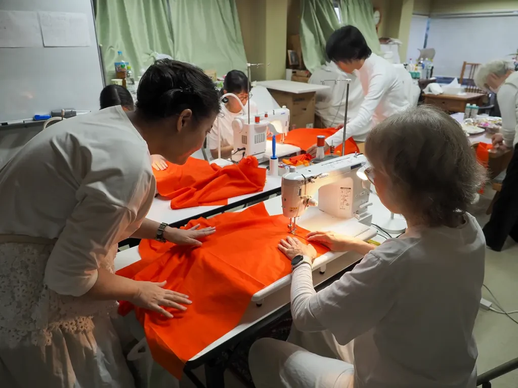 午前中には1枚の布だったオレンジの生地は、すぐに3Fに運ばれ、カティナ衣を縫うチームのみなさんの手で一日で衣に仕立て上げます。