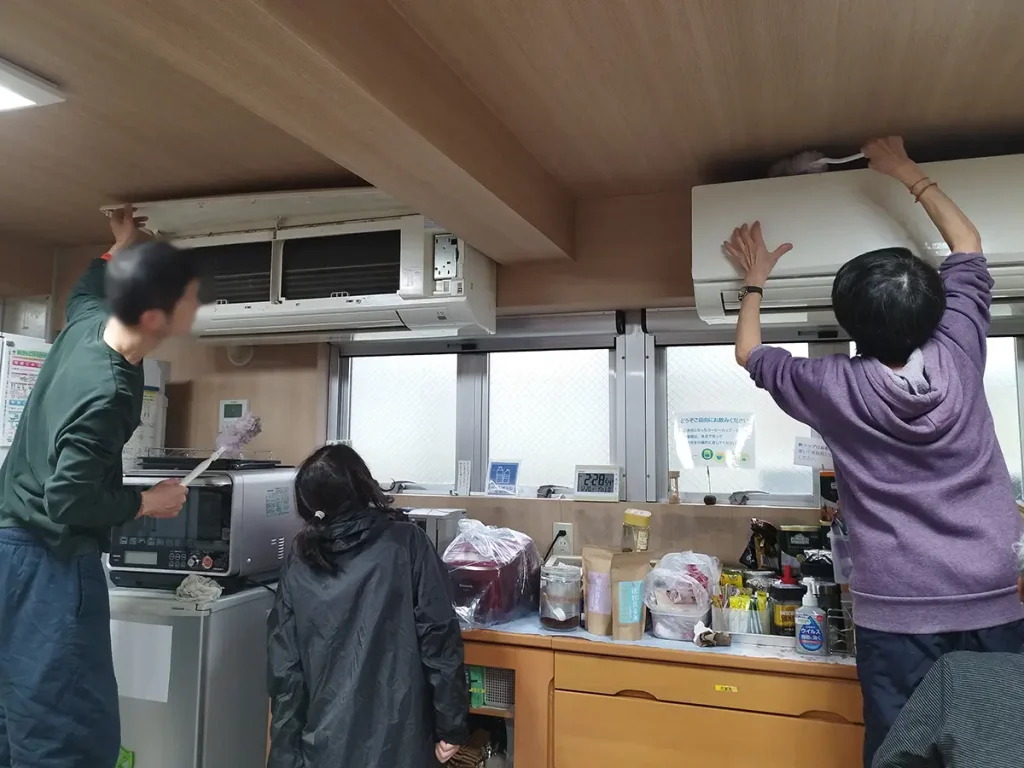 エアコンも、玄関の靴箱も、ガレージも、トイレも、本堂の畳も、壁も、扇風機も、本棚も、3Fのシャワー室も、階段も、台所も、みなさんできれいにしてくださって、来た時よりも精舎の中が明るく見えました。