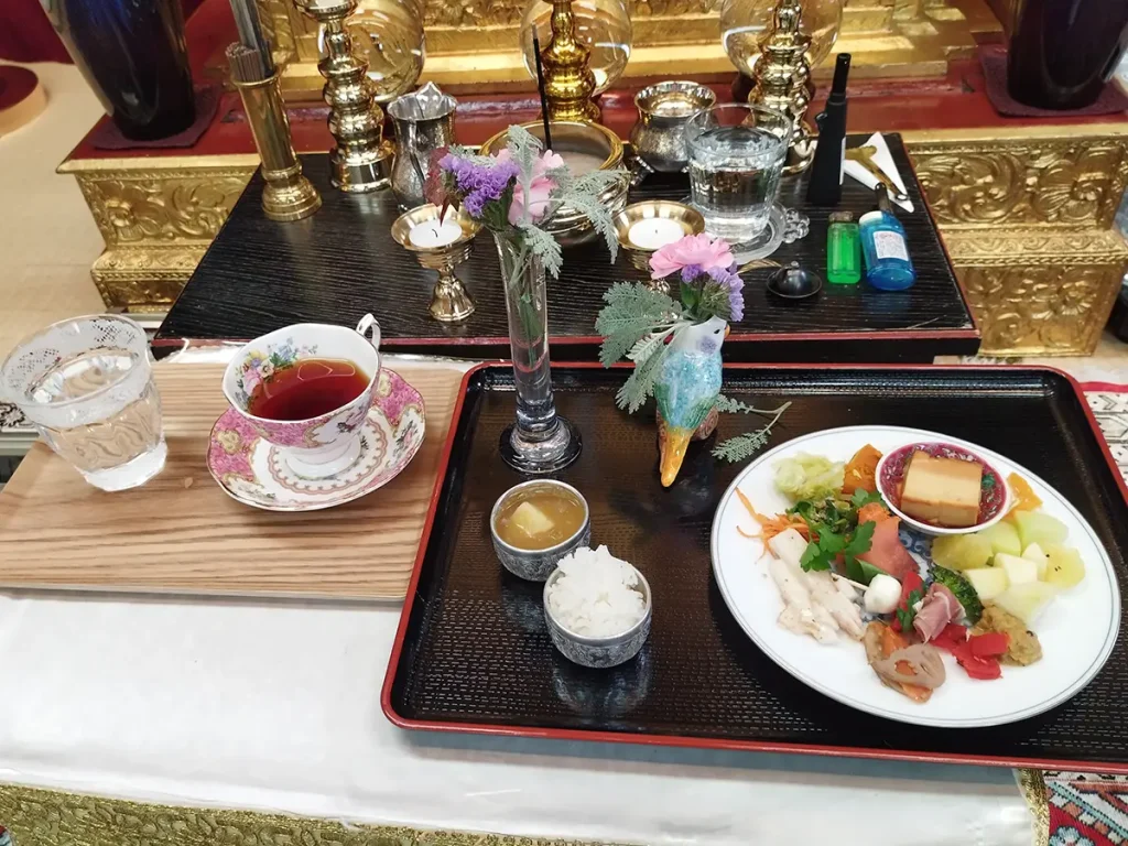 11:00からはブッダ・プージャです。ヤサ長老、ヘーマラタナ長老、パドゥマ師、プンナ師がご参加くださり、パドゥマ師の導師でお供えの読経をいたしました。