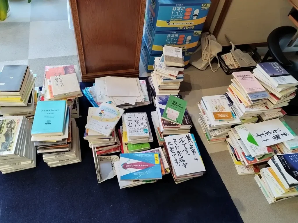 朝一番に発見したのは、前日、小学生ご兄弟がせっせと3Fから運んでくださった、蔵書の山。当日にやるはずだった力仕事を、やっておいてくださいました。感謝です♬