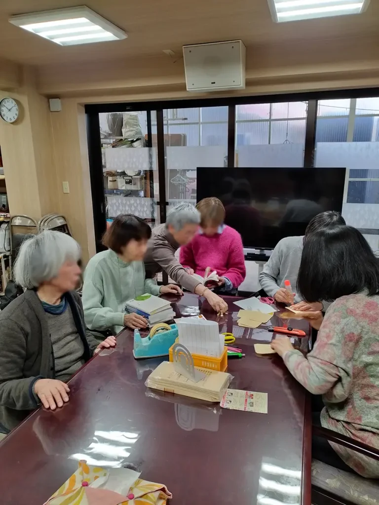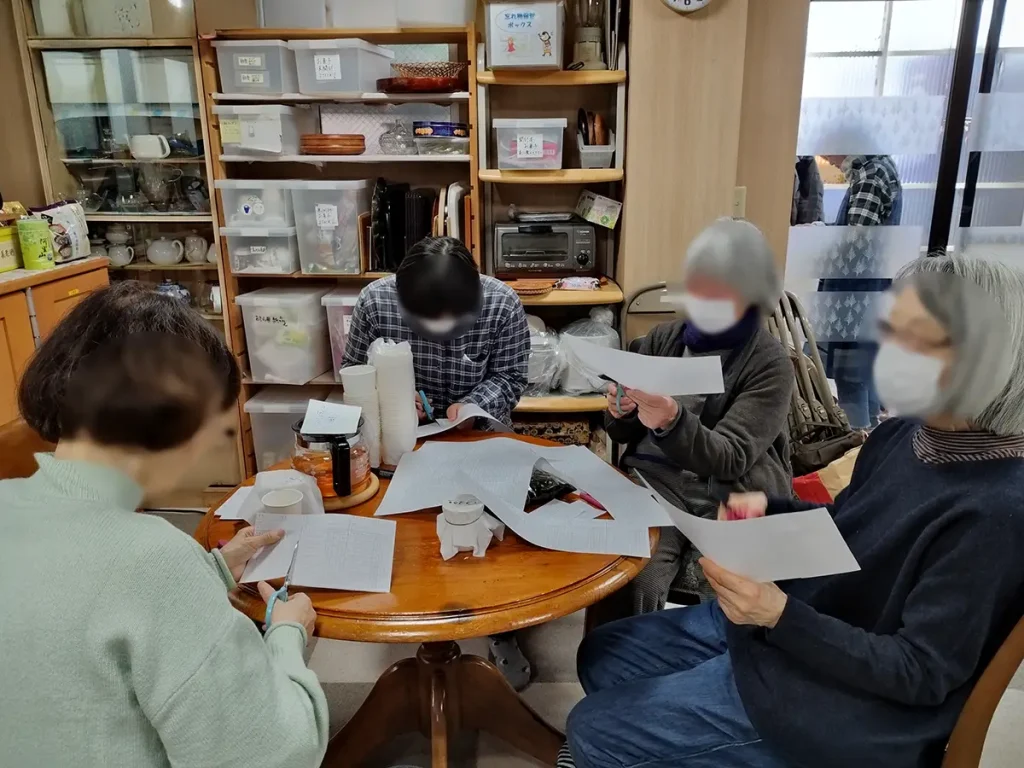作業は、本に貸出カードポケットを貼り、カードに本の名前を書き、「持ち出し禁止」のシールを隠し、貸出用の本に生まれ変わらせて本棚に並べる作業です。しかし、カードの数量が足りないことが発覚しました。そこで貸出カードポケットは封筒で手作りし、カード本体はコピーで代用することに。みなさん、問題が起きてもめげません。